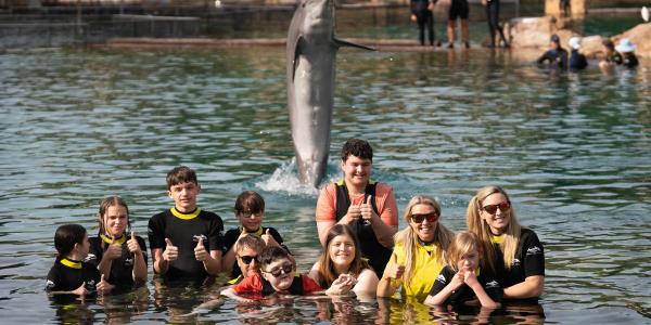 周日,他们在海洋世界的探索湾进行了倒数第二次旅行,有机会和海豚一起游泳。