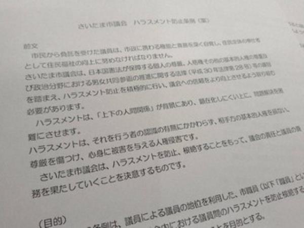 受2021年市长选举期间的一次事件的推动,埼玉市政府也正在采取措施制定反骚扰条例。一家报纸公司在一名女记者遭到多名议员骚扰后,向市议会投诉。据知情人士透露,这名记者当时正在采访自民党(LDP)支持的一名候选人的竞选活动。在个别采访中,年轻、中层男性议员们纷纷对她说:“再穿突出胸部的衣服吧”、“如果我们谈话,你会让我看看你的胸部吗”、“如果我是单身,我也会和你上床”等粗俗的话。