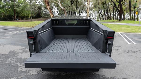 我们花了很多时间在赛博卡车的六英尺货箱里爬来爬去。它由一个动力可伸缩的吨盖覆盖,在关闭时支持高达300磅的重量,以及一个手动操作(但电动释放,阻尼和反弹簧)的后挡板。床地板下面有一个“箱子”,由本田Ridgeline首创,带有排水塞,可以用作饮料或新鲜捕获的比目鱼的冰柜。在前面,地板上有螺栓固定着一个大的访问面板,大概是为了进入这只野兽的电化学心脏。