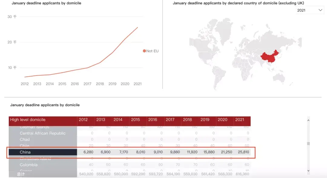 其中,申请2021年入学英国本科的中国学生人数达到25,810,创下历史新高,相较2020年同期增长了21.46%。