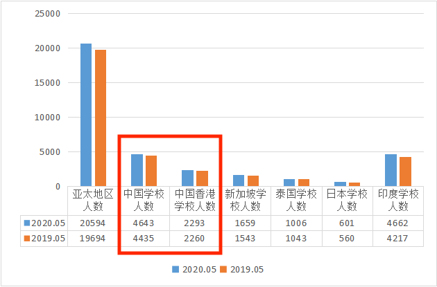 官方数据统计,2020年5月全球共有分别来自146个国家和3020所IB学校的学生参加考试。亚太地区考生数量一直相对稳定,占比约为12%,其中来自中国、新加坡、日本等地区的考生数量较多。