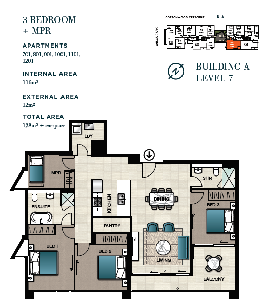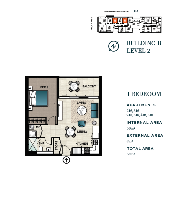 大多数公寓朝向Wilga Park和Shrimptons Creek。Wilga Park得到Ryde市政府500万澳元投资以及全新改造升级,成为可以进行各种户外活动的好去处。在各种步道、自行车道、户外用餐和休闲区之外,还拥有独具一格的艺术元素。