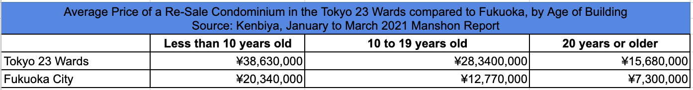 即使是相对较新的、楼龄不到十年的房产,福冈的买家看到的平均售价也只有东京23区(Tokyo 23 Wards)的52%左右。