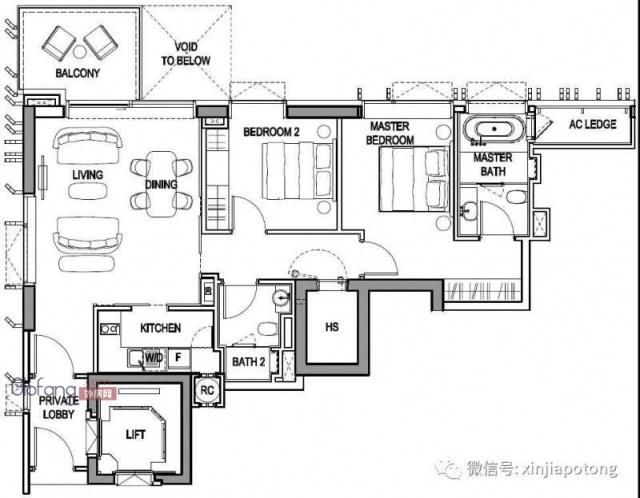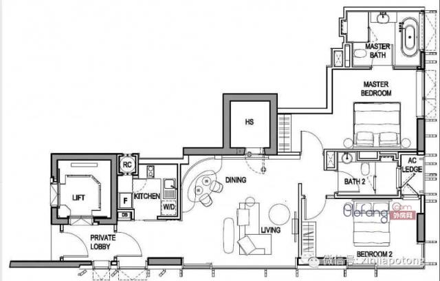 2房户型图,面积为99平方米,私人电梯直接入户,连主卧卫生间带浴缸,价格326.2万新币起
