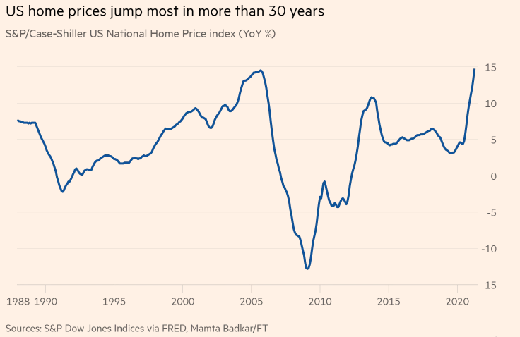 美国房价去年飙升,因为美国人利用创纪录的低抵押贷款利率抢购郊区的房子。这种需求,加上住房供应紧张,将房价推高至创纪录的水平。今年早些时候,木材成本的急剧上升进一步加剧了这种情况。
