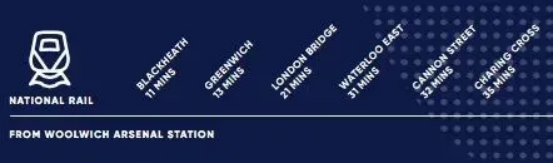 从距皇家水岸同样仅300米的城铁站Woolwich Arsenal出发,以下地点皆可在10站内到达:布莱克西斯、格林威治、伦敦塔桥和查令十字街。