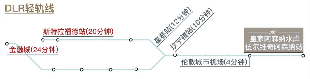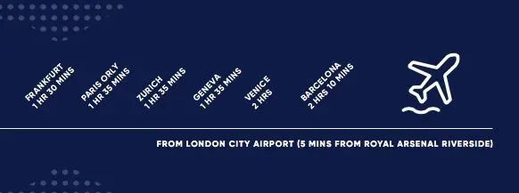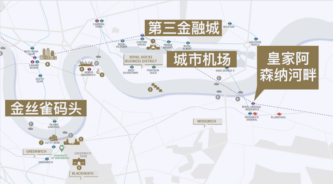 从距皇家水岸仅300米的伦敦轻轨(DLR)Woolwich Arsenal站出发,可在半小时之内到达伦敦城市机场(CityAirport),与项目隔河相望的第三金融城,第二金融城金丝雀码头。