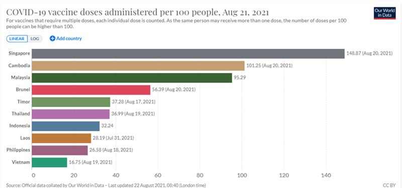今年四月份开始,柬埔寨疫苗接种在东盟各国中一直处于领先地位,目前,已经走在了世界前列,是世界卫生组织西太平洋区域新冠疫苗接种率最高的国家之一。