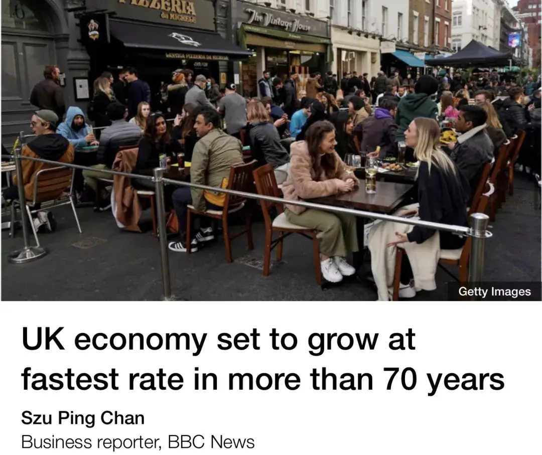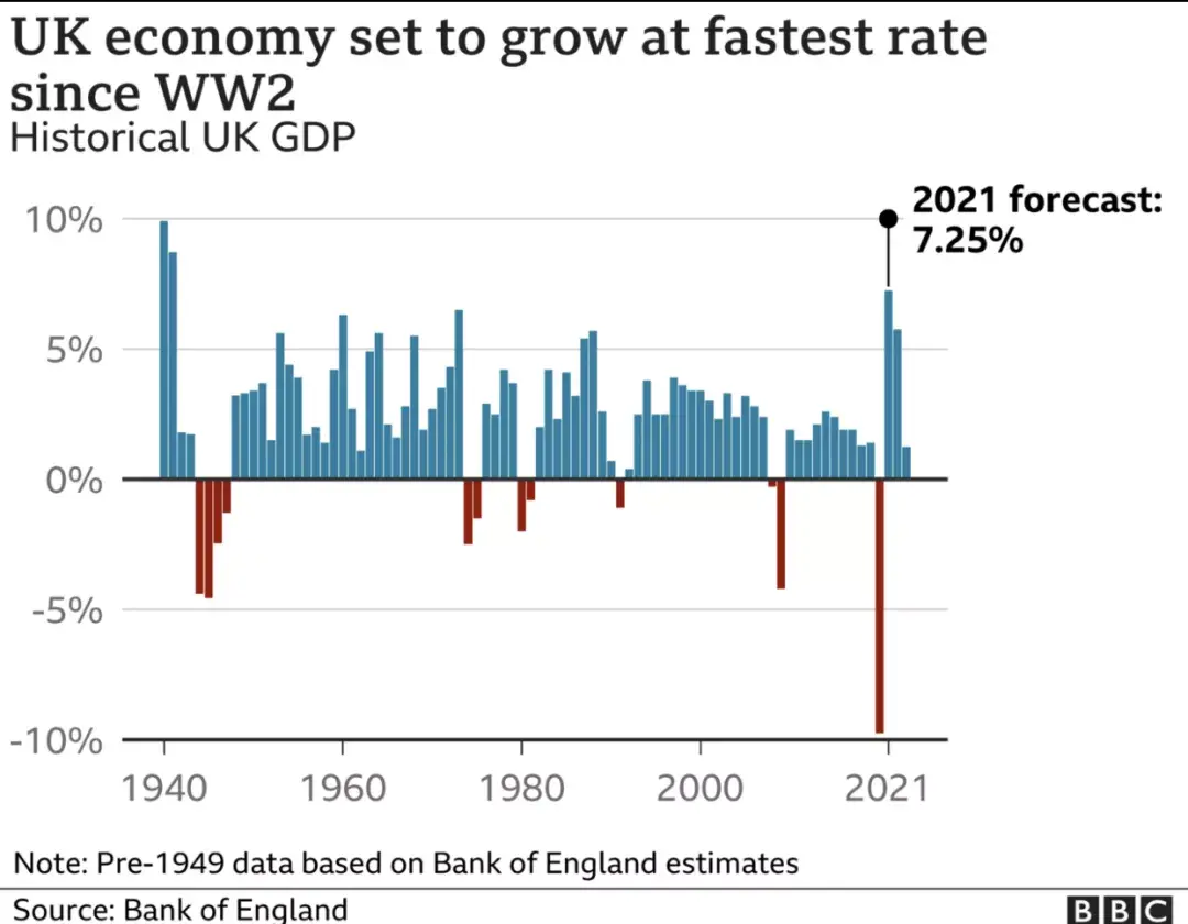 英格兰银行的数据显示,随着英国针对新冠疫情采取的限制的解除,英国经济预计将增长 7.25%,或将实现70多年以来的最快增长。