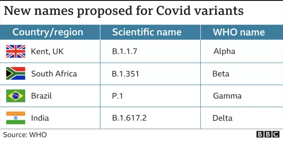 比如,英国的新冠变异病毒将被标记为Alpha,南非的变种被命名为Beta 以及印度的变种被标记为Delta。