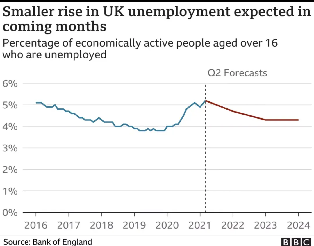央行现在预计失业率将在今年晚些时候达到 5.5% 的峰值,远低于 2 月份预测的 7.75%。政府的额外支出有助于限制失业。