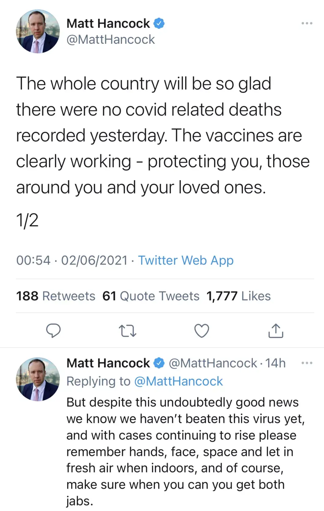 英国卫生部长马特·汉考克发布推特表示,整个国家的人听到这个消息都会“很高兴”。他说:“疫苗显然是有效的——它能够保护你、你周围的人和你所爱的人。“
