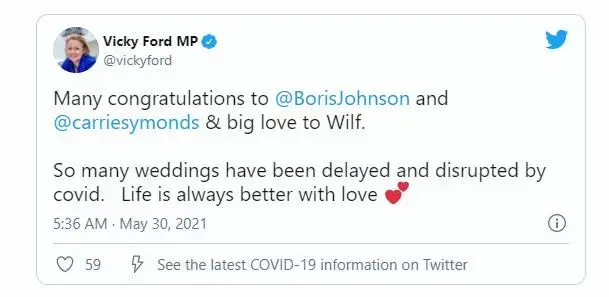 比如英国儿童事务大臣维姬·福特在推特上艾特了约翰逊夫妇,并写道:“很多婚礼都因为新冠疫情而推迟或中断。爱总是能让生活变得更加美好。”