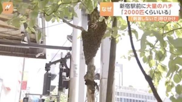 周二下午,东京新宿站前的人行道上发现一大群蜜蜂聚集,当局敦促人们避免制造干扰。