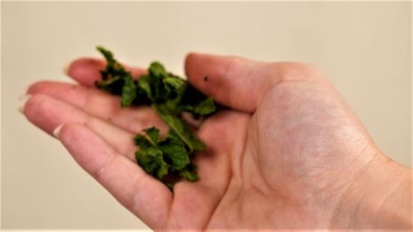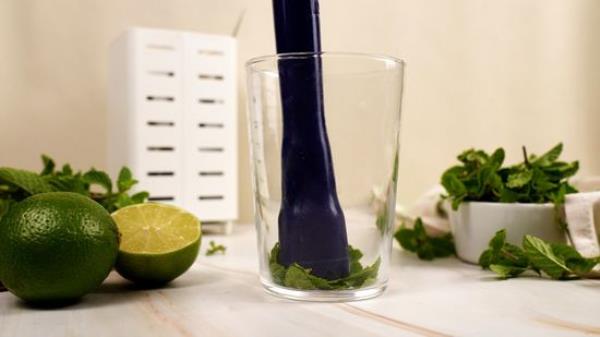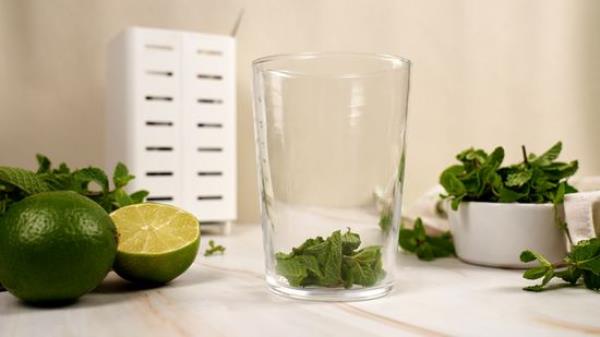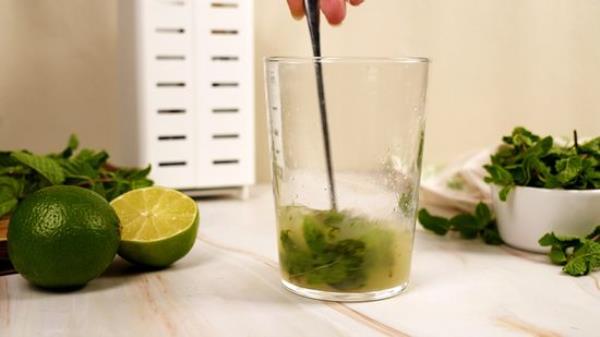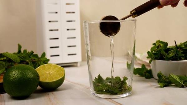 轻轻地按下搅拌器放入薄荷叶,捻几下。不要将叶子切碎、压碎或剁碎,因为这样会释放叶绿素co