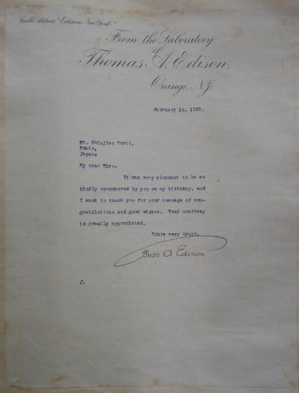 在堀井慎次郎家所在的东omi县志贺市的“Gariban denshokan”会馆里,发现了用21厘米× 28厘米的纸板制作的感谢信和信封。这封信于去年10月被发现,寄自托马斯·爱迪生的实验室,日期为1922年2月16日。信上写着:“在我的生日那天,能被你如此亲切地记住,我感到非常高兴,我要感谢你的祝贺和良好祝愿。非常感谢您的好意。”文字后面是爱迪生的亲笔签名。