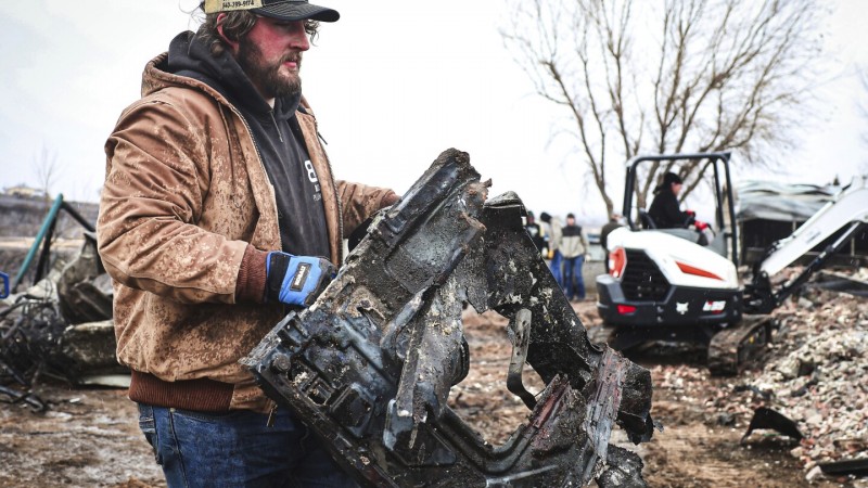 在受灾严重的斯廷内特镇(Stinnett),人口约为1600人,像他这样从烟屋河(Smokehouse Creek)大火中撤离的家庭周四回到了毁灭性的景象:融化的路牌和烧焦的汽车和卡车框架。房屋变成了成堆的灰烬和瓦砾。一面美国国旗竖立在被毁的房子外面。